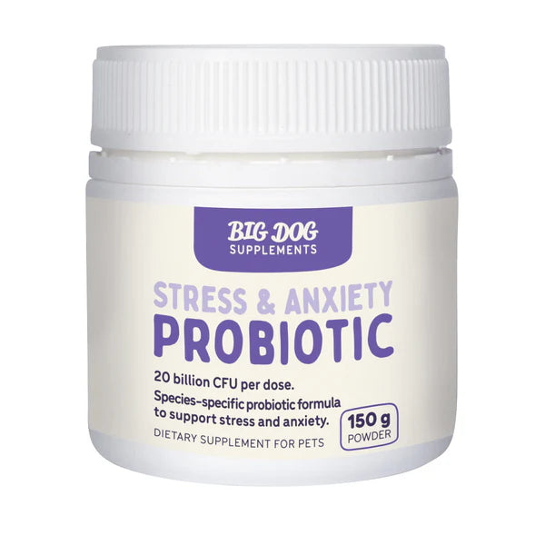 Big Dog Stress and Anxiety Probiotic is a high-strength formula with 20 billion good bacteria per 5g serve. Containing 7 species specific probiotic strains, this formula has been developed to assist the regulation of the gut microbia to support dogs with stress and anxiety. With the added benefits of 5 digestive enzymes and a natural prebiotic, green banana powder, Big Dog Stress and Anxiety Probiotic supports digestive function, a properly functioning immune system and reducing inflammation in the gut.