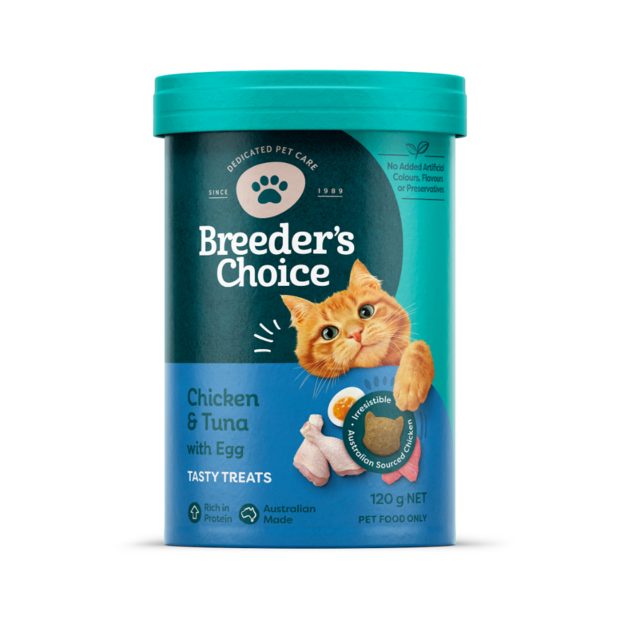 Breeders Choice Cat Treats, Chicken, Tuna and Egg is a protein-rich, all-natural treat made with chicken, tuna, and egg, perfect for keeping your cat healthy and active. Crafted in Australia using locally sourced ingredients, these treats contain no artificial flavours, colours, or preservatives.