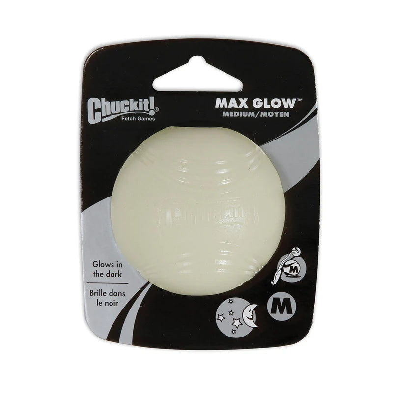 The Chuckit! Max Glow Ball gives your dog something to jump for with this super bouncy ball! This durable rubber ball glows in the dark to allow the game to keep going when the sun goes down. It charges quickly under any bright light taking just five minutes to generate 20 to 30 minutes of glowing playtime (no batteries or cords needed). Easy to clean and your dog will love this textured grip-able rubber ball made just the right size to use perfectly with the compatible size Chuckit! Sport Launcher (sold separately).